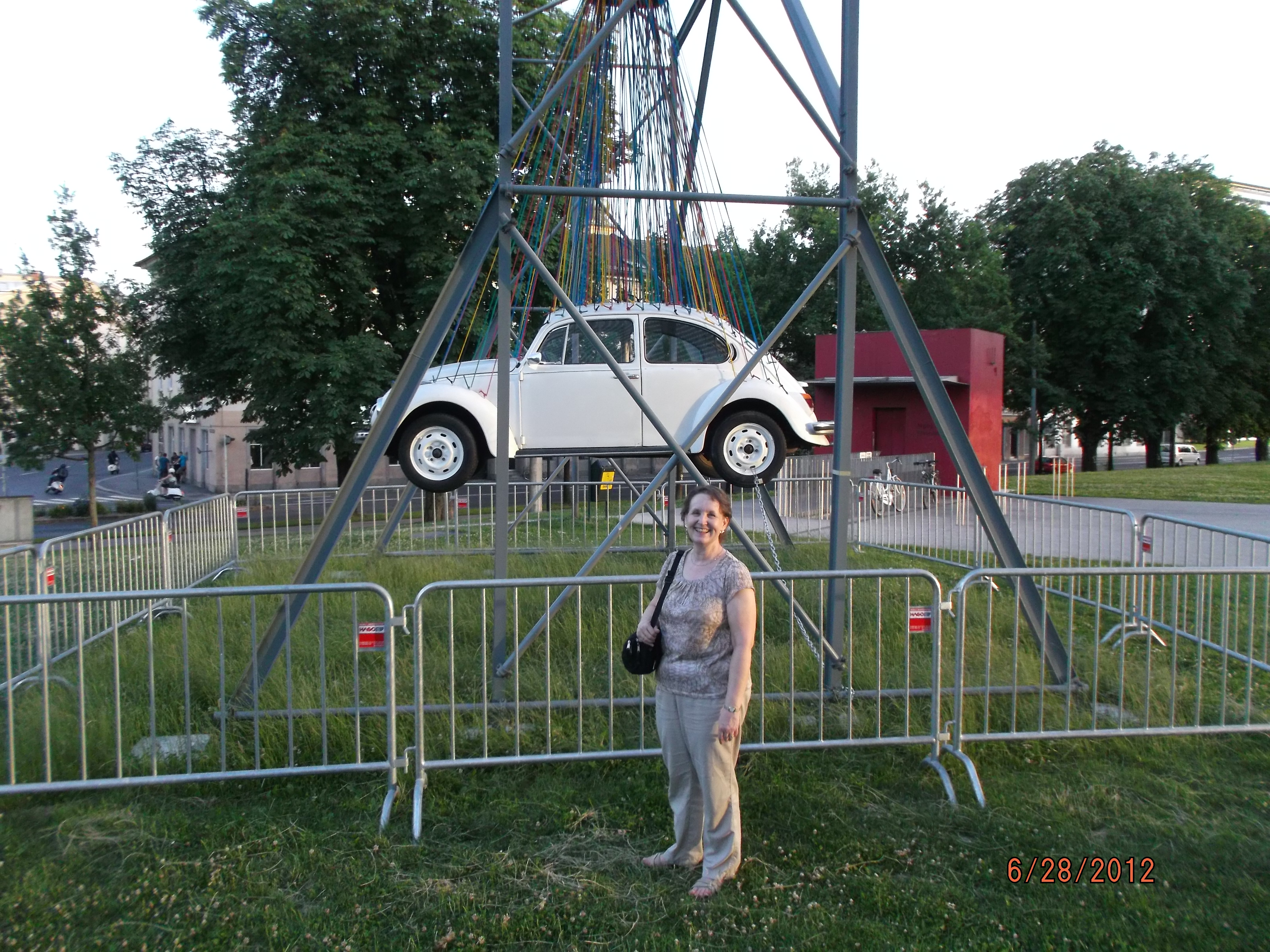 Barbara Young next to swinging VW bug at the Lentos Museum on the Danube