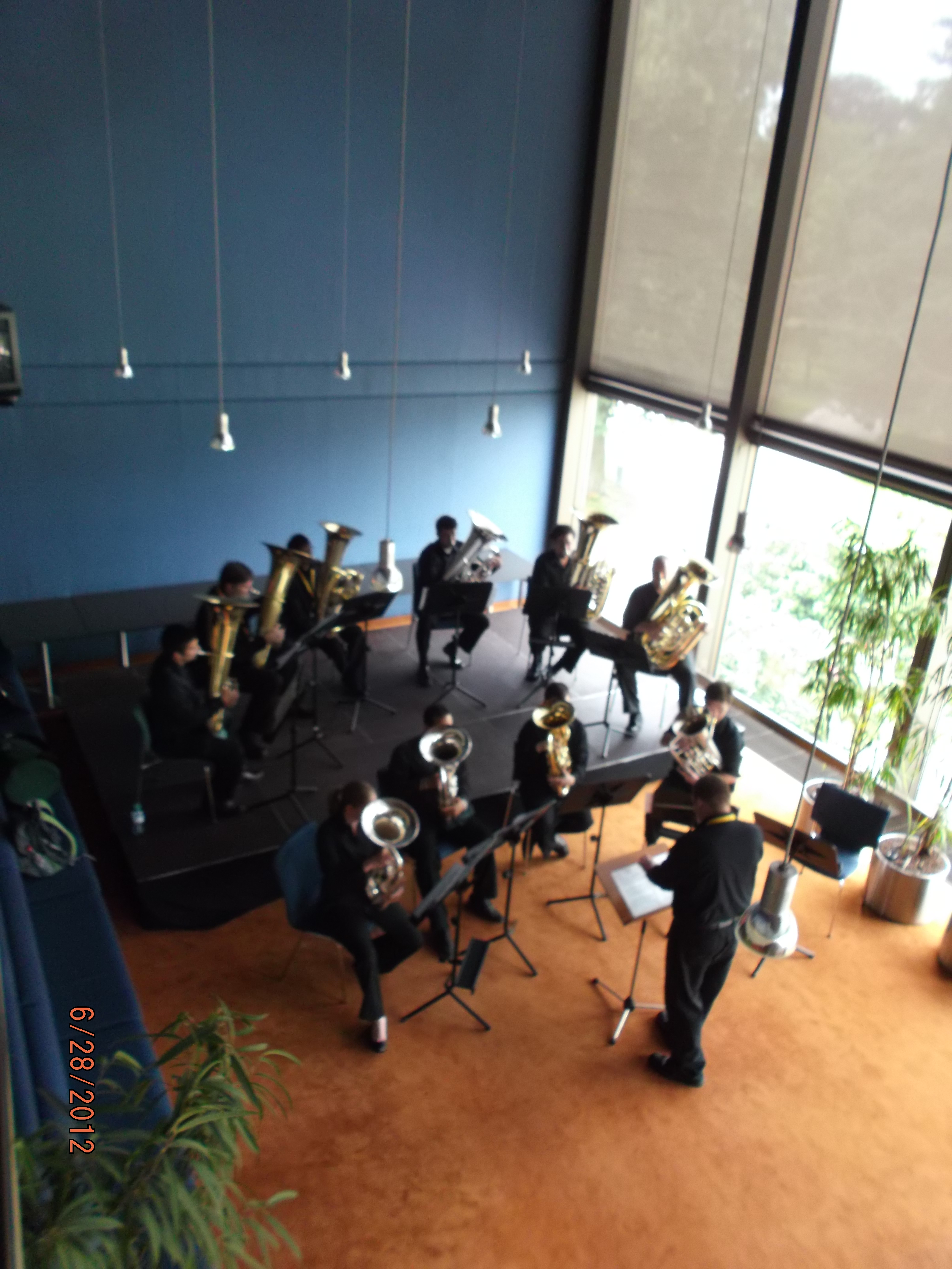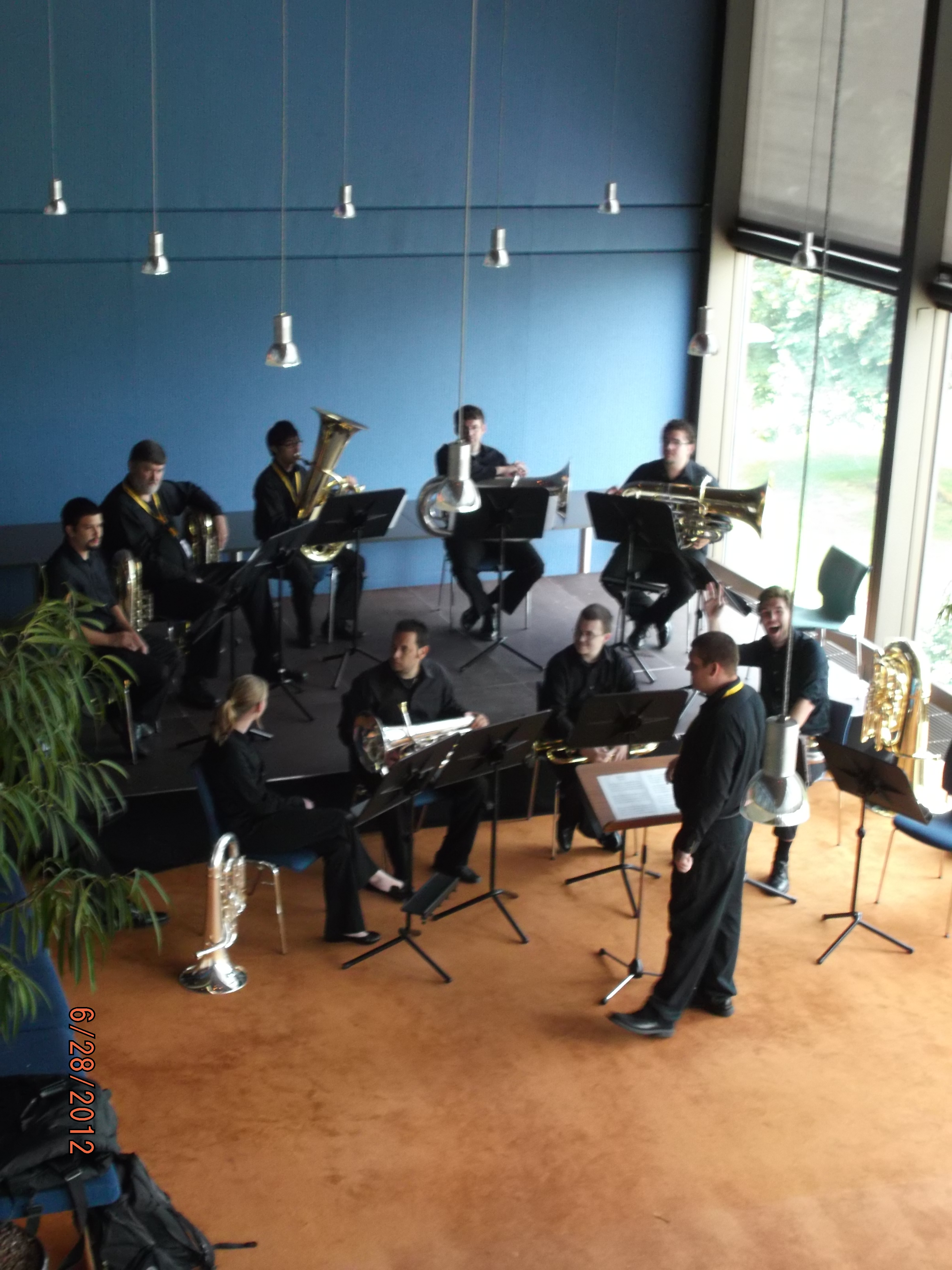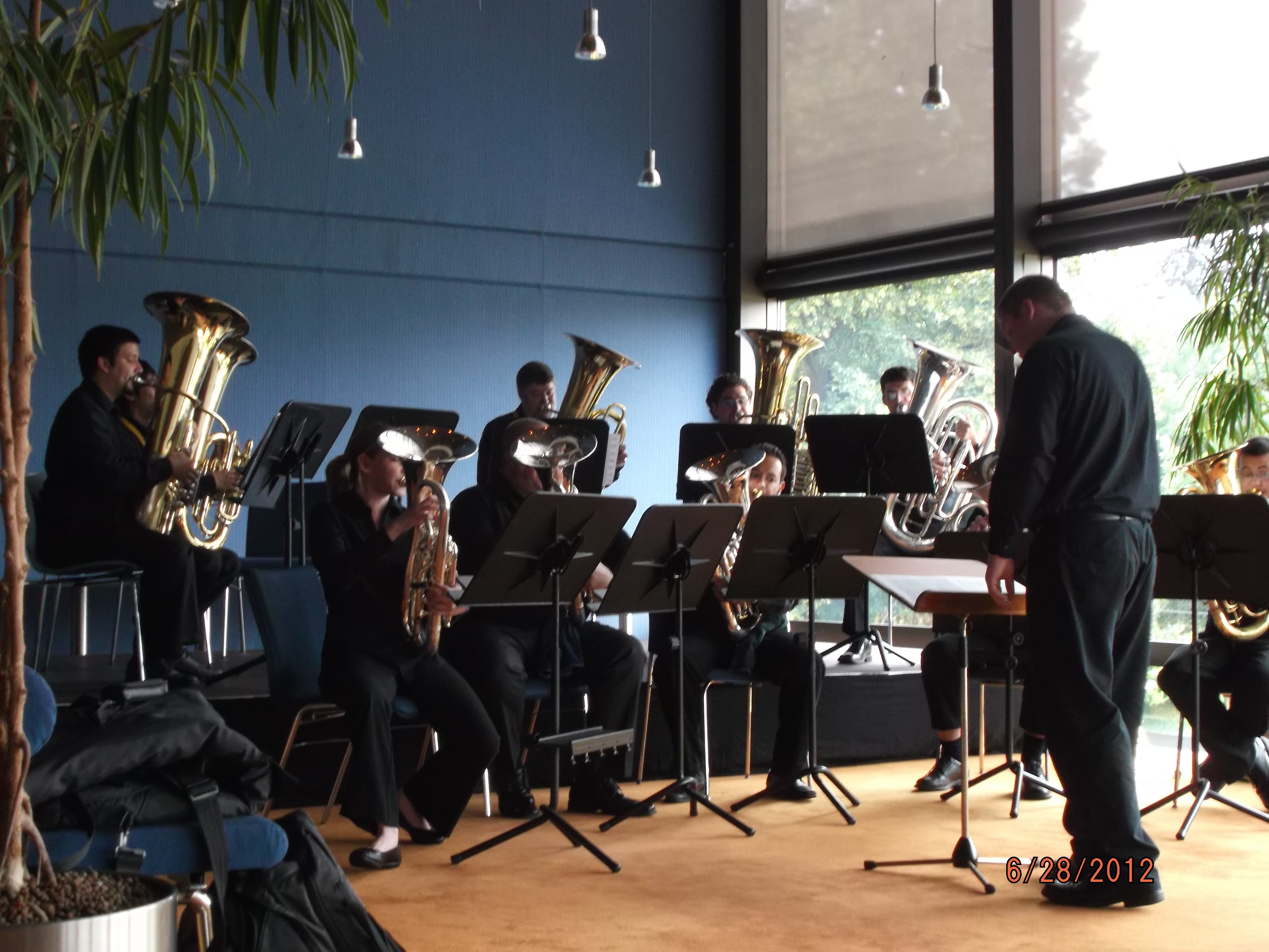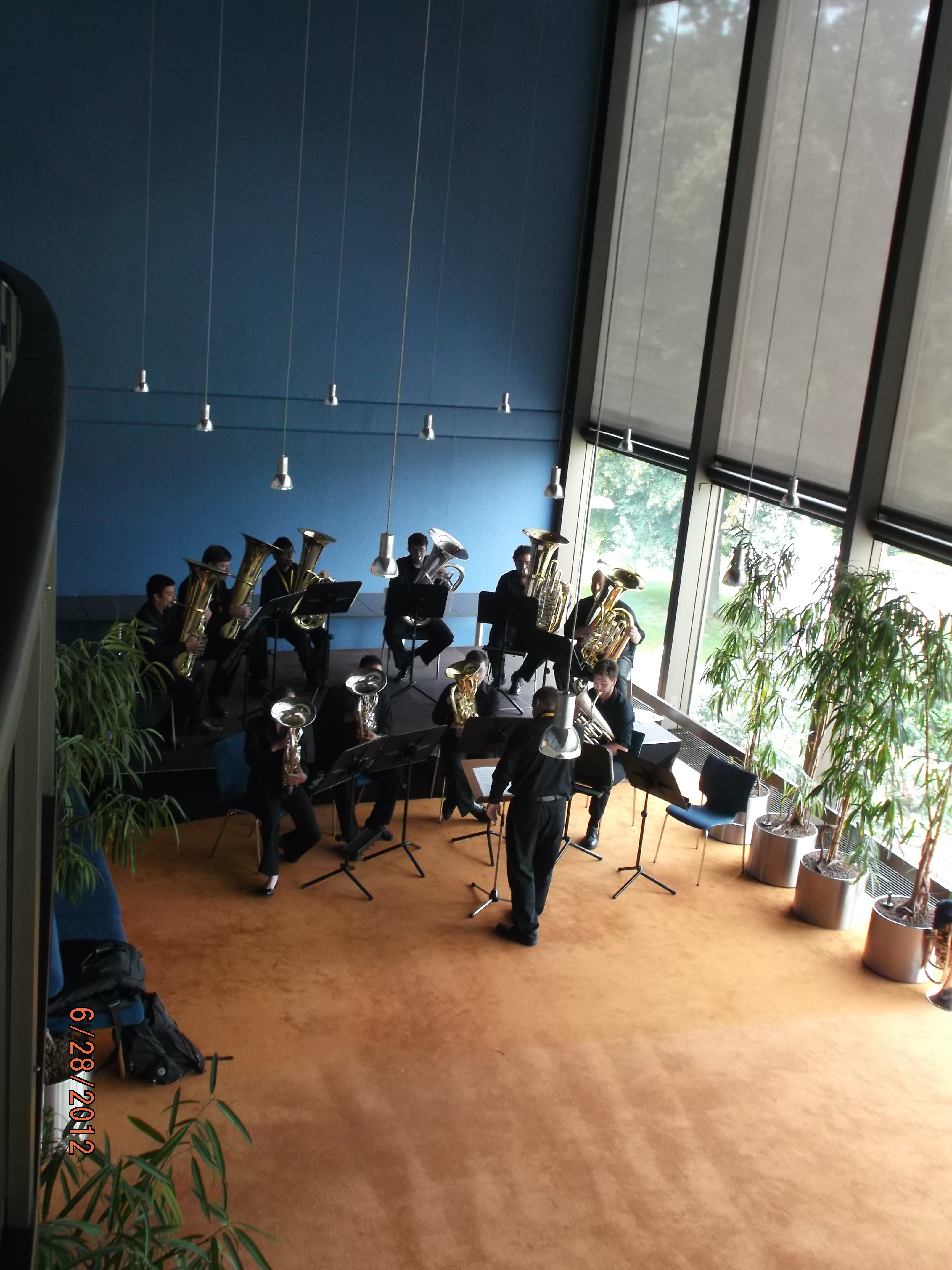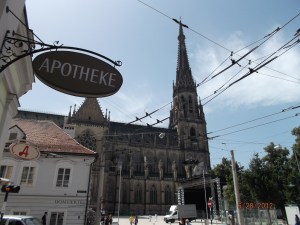 It was another fabulous day in Linz. I had my usual hearty hotel breakfast, took the tram to Brucknerhaus in my blacks with tuba for the 12:30 PM University of Arizona tuba/euphonium ensemble concert I played in. Before our concert I heard Jason Byrnes of University of Northern Colorado do a great solo tuba recital. After our concert I took the tram back to the hotel to change into a beach shirt and shorts. I did some additional shopping along Landstrasse and to look at the exterior of the New Cathedral a block over (completed in 1924) before going back to Brucknerhaus to take in the James Madison University brass band conducted by my old ASU classmate Kevin Stees. Later I caught up with his whole family including his lovely wife Rhonda who played oboe in a graduate woodwind quintet on one of my recitals. After the ITEA general meeting, I caught up with Heiko Triebener, tubist with the Melton Quartet and Bamberg Symphony, and Barbara and Jerry Young going back to the Beer Garden for a delicious dinner of authentic Austrian food helped by Heiko’s fluent German to the waiter!